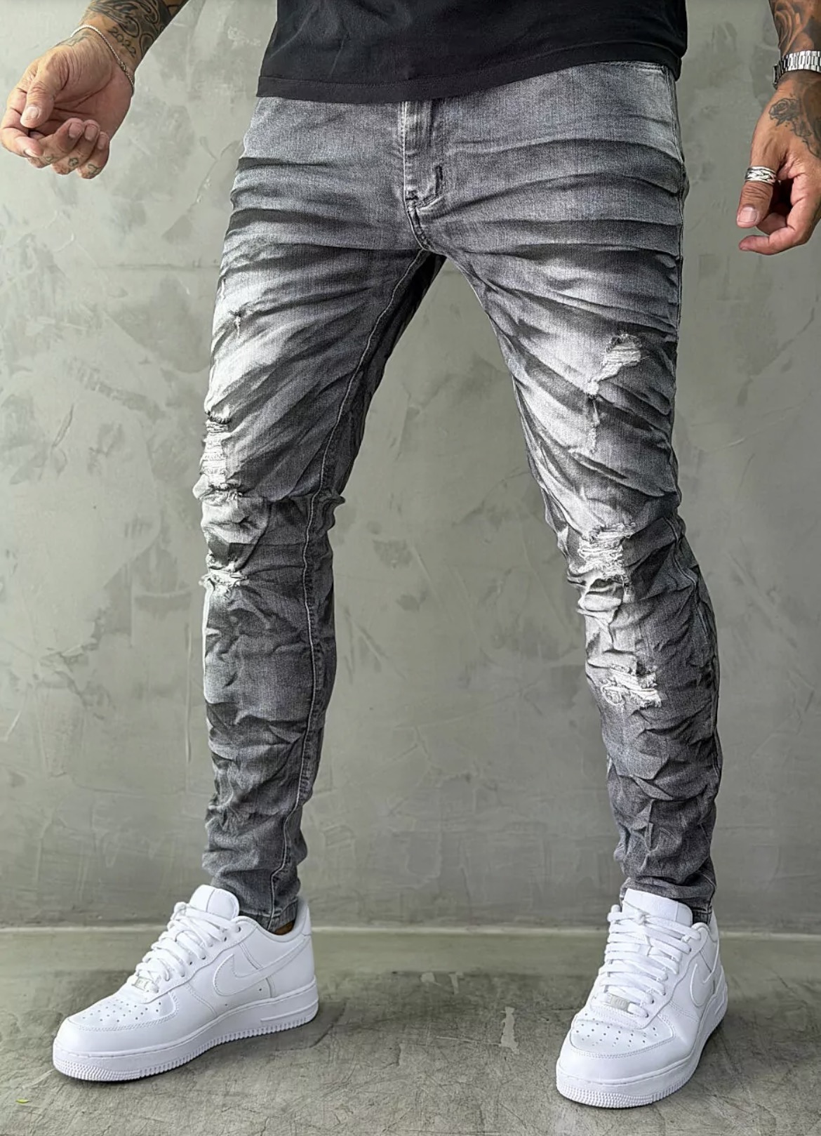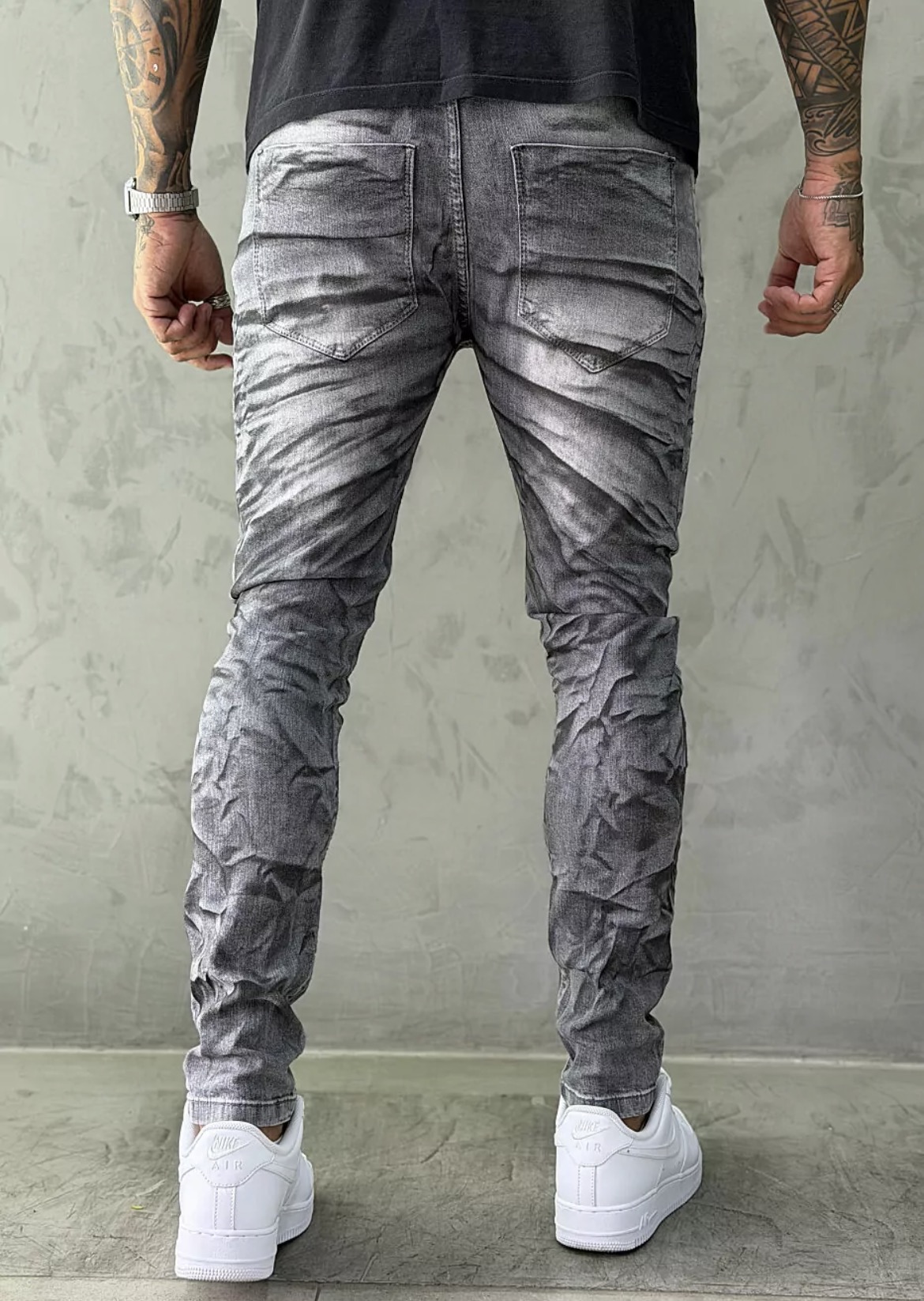A calça jeans cinza marmorizada é uma peça moderna e cheia de personalidade. Confeccionada em denim de alta qualidade, ela apresenta uma lavagem especial que cria um efeito mesclado, lembrando mármore, com variações sutis entre tons de cinza claro e escuro. O visual único traz um ar urbano e estiloso, ideal para quem busca fugir do básico.